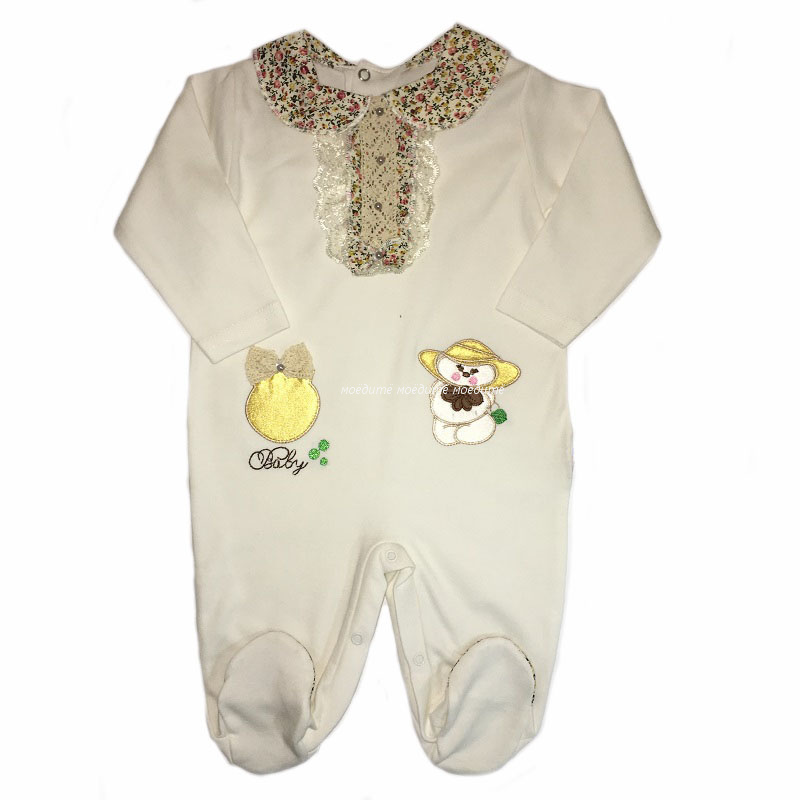 Комбинезон с длинным рукавом без манжетиков , с закрытыми ножками, с отложным воротничком контрастного цвета, сзади однотонный, спереди украшен аппдикацией, на 2 кнопочках сзади только сверху и на кнопочках между ножек под памперс.